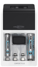 ANSMANN Chargeur rapide Comfort Plus, blanc/noir – pour 1 à 4 piles rechargeables Micro AAA, Mignon AA ou 1 à 2 Micro AAA, Mignon AA et une pile rechargeable 9V, test rapide de capacité, chargement préalable doux, analyse des piles, mode de chargement rapide, coupure IQ, (1001-0094) chargement Top-Off, charge d’entretien, fiche Euro,