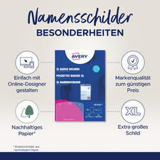 – simple & professionnel : avec les produits Avery, vous pouvez utiliser le concepteur en ligne gratuit sur www.avery.eu/print. Créez votre badge entièrement vous -même avec le logiciel, utilisez l’un des modèles de design parmi les nombreux thèmes personnalisables, ou téléchargez votre design terminé avant de l’imprimer au format qui convient. Rien de plus simple et rapide pour soigner votre présentation. Exemples d’utilisation :
