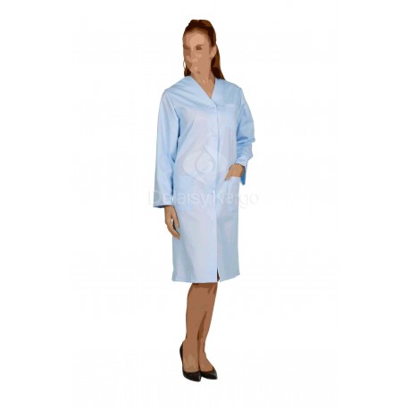 Blouse de travail femme poly-coton unie MADONNA 67% polyester, 33% coton. Col tailleur, manches longues, 1 poche poitrine + 2 poches côtés, fermeture 5 pressions. L 105 cm.