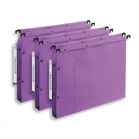 En kraft 230 g. Barrette de suspension en métal. Porte-étiquette plastique effet loupe. Double mise en continu par volet d’agrafage et boutons-pression métal. Fonds V en carte renforcée Noire. Entraxe : 33 cm.