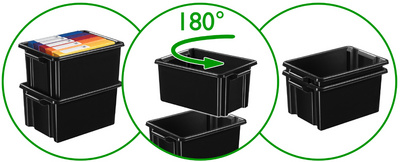 • les boîtes sont empilables et emboîtables par simple rotation à 180° quand le bac est vide