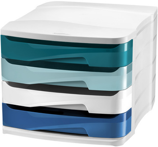 CEP Module de classement Riviera, 4 tiroirs, blanc / bleu – en polystyrène, empilable, pour format A4, avec butée d’arrêt, coulisse de tiroirs et poignée, avec patins antidérapants, dimensions: 292 x 386 x 246 mm (394 RiM / 1003940511)