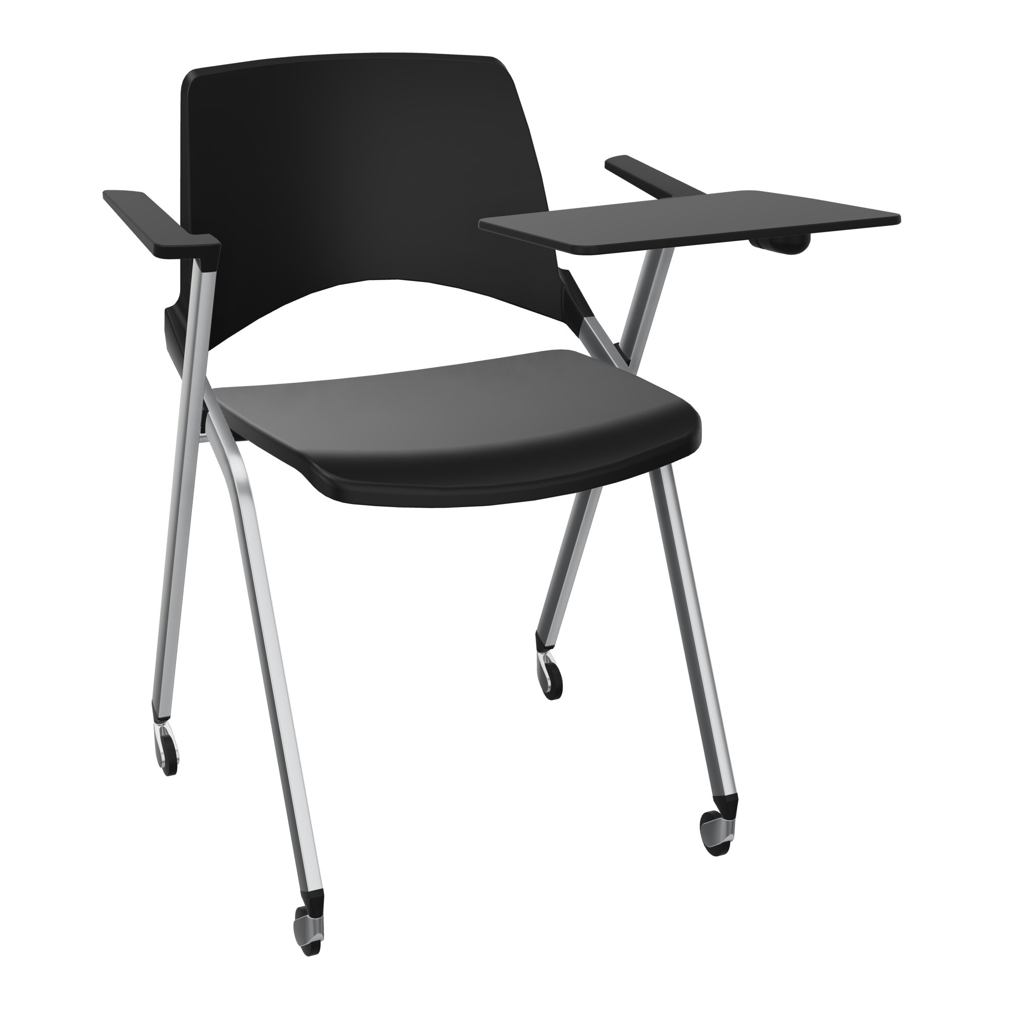 Chaise Emi dossier assise polypropylène noir fixe avec accoudoirs tablette à gauche 4 pieds sur roulettes métal chromé