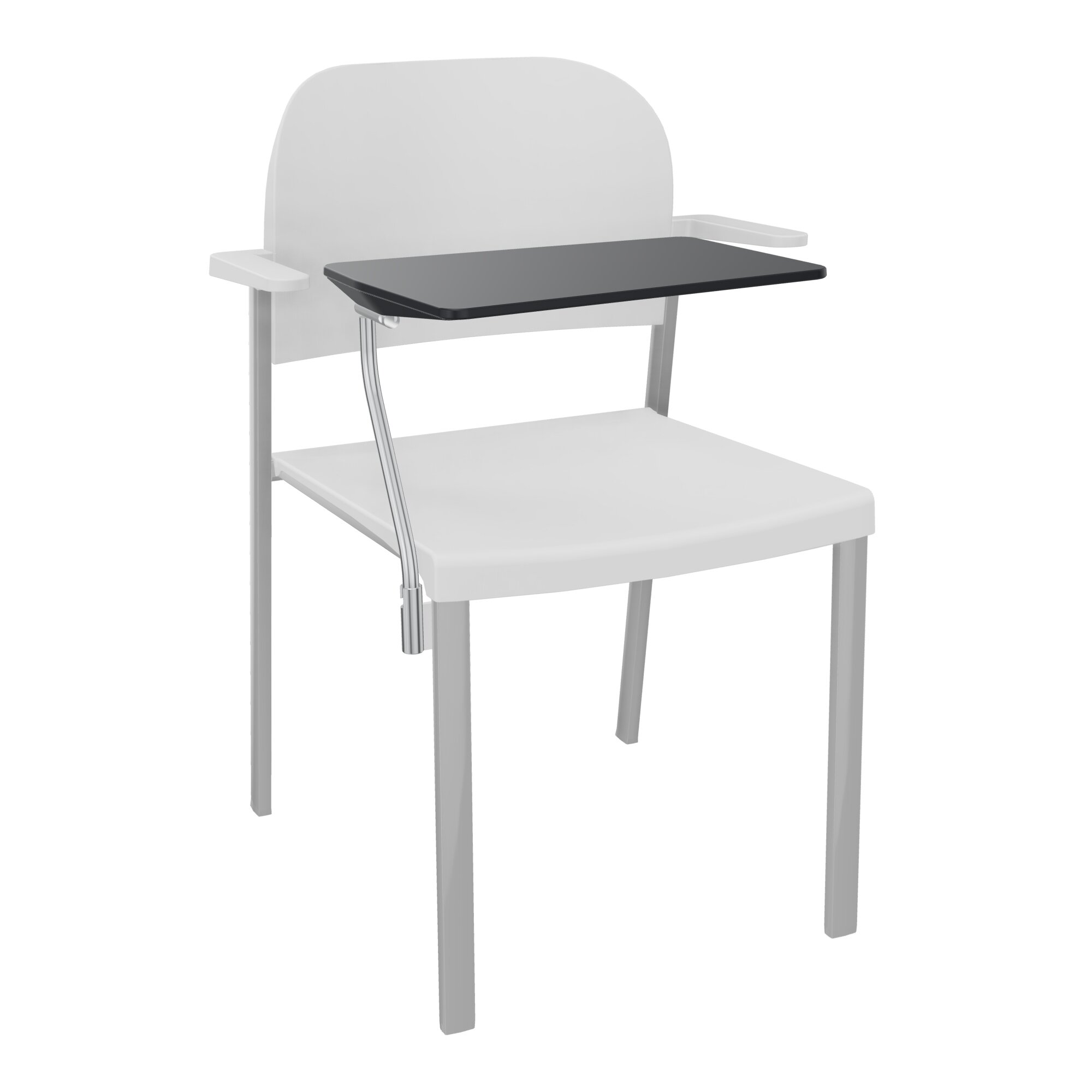 Chaise Romy assise et dossier polypropylène blanc avec accoudoirs et tablette noire sur 4 pieds fixe métal gris aluminium