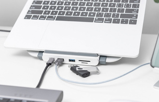 -C entièrement fonctionnel, deux ports USB A (USB 3.0) et un lecteur de carte pour cartes SD et microSD