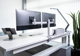 • le support est composé d’une colonne de table, d’une traverse et de deux supports VESA coulissants et rotatifs pour les moniteurs
