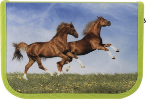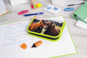 EBERHARD FABER Étui scolaire Cheval, 42 pièces – en polyester, dimensions: (L)196 x (P)132 x (H)34 mm, avec 2 rabats intérieurs, motif: chevaux, couleur: vert fluo, garni (577589)