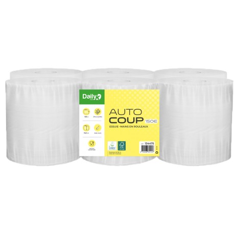 Autocoup 150 E essuie-mains en rouleaux | Carton de 6 De qualité extra, cet essuie-mains double épaisseur en rouleau de 150 m est très absorbant. Livré en colis de 6 rouleaux, de quoi réguler votre cadence d’approvisionnement.