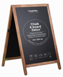 EUROPEL Panneau trottoir DELUXE, 660 x 1.040 mm, naturel – cadre robuste verni en bois de pin, avec bords arrondis et coins en onglets, tableau noir en bois composite, surface inscriptible avec des marqueurs craies, effaçable avec un chiffon humide, s’utilise des deux côtés (356245) équipé de pieds de protection sous les supports, pour l’intérieur et l’extérieur