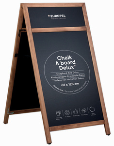 EUROPEL Panneau trottoir DELUXE, 660 x 1.280 mm, noir – cadre robuste verni en bois de pin, avec bords arrondis et coins en onglets, tableau noir en bois composite, surface inscriptible avec des marqueurs craies, effaçable avec un chiffon humide, s’utilise des deux côtés, avec en-tête (356246) équipé de pieds de protection sous les supports, pour l’intérieur et l’extérieur