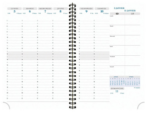 • Calendrier: 1 semaine sur 2 pages, espace pour les notes sur la droite