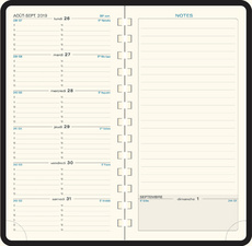 • Calendrier: semainier, 1 semaine sur 2 pages, 1 page de notes