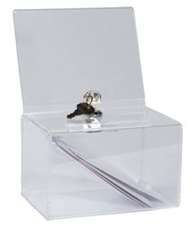 EXACOMPTA Urne, en acrylique, fermable à clé, transparent – avec fente, couvercle à charnière amovible, idéal pour les concours, tombolas, élections ou boîte à idées, avec affichette A6, dimensions: (L)150 x (T)105 x (H)100 mm (89358D)
