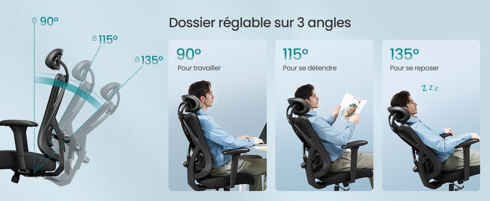 Différents angles pour différents besoins : Vous souhaitez vous concentrer sur votre travail, vous reposer ou faire une sieste ? Vous pouvez tout faire avec cette chaise de bureau grâce à son dossier inclinable à 95°, 115° e 130°