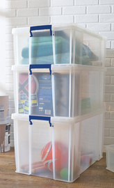Fellowes Boîte de rangement ProStore Bonus Set 2, set de 3 – transparent incolore, en PP recyclable, résistant aux chocs, avec couvercle, empilable, fond & coins doublement renforcés poignées latérales pour la fermeture, étanche, contenu : 2x 70 litres, 1x 85 litres, emballé en carton (7731301) dimensions intérieures 70 L : (L)580 x (P)385 x (H)300 mm dimensions intérieures 85 L : (L)575 x (P)380 x (H)375 mm convient à un usage alimentaire