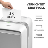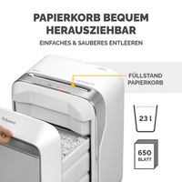 Fellowes Destructeur de documents Powershred LX 211, noir – coupe croisée: 2 x 12 mm, capacité de découpe: 15 feuilles, volume de la corbeille: 23 litres, largeur d’entrée: 230 mm, niveau de sécurité: P-5/T-5, détruit cartes de crédit/agrafe /trombones, affichage Intellibar, SafeSense, mode veille (5050201)