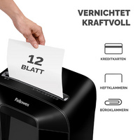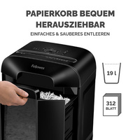 Fellowes Destructeur de documents Powershred LX85, noir – coupe en particules: 4 x 40 mm, capacité de découpe: 12 feuilles, volume de la corbeille: 19 litres, largeur d’entrée: 224 mm, niveau de sécurité: P-4/T-4, détruit cartes de crédit, agrafes & trombones, SafeSense, fiche euro (4400801) dimensions : (L)341 x (P)246 x (H)470 mm