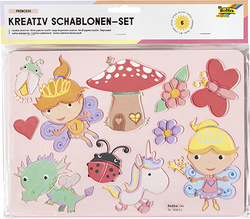 – pochoirs sur le thème de la princesse et des créatures fantastiques : pochoir rose vif : petites fées, pochoir rose clair : licorne, pochoir violet : château et carrosse, pochoir orange : princesse, pochoir bleu : sirène, pochoir abricot : papillons Exemples d’utilisation :