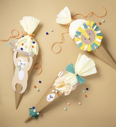 folia Schultüten-Bastelset SAFARI SCHOOL, 3 Motive – Inhalt: 1x Schultütenrohling, natur, 6-eckig, Krepppapier, Stanzbögen bedruckt, Pompons, Stickgarn, Satinband, 3D Klebebpads, doppelseitiges Klebeband zum Basteln von 1 Schultüte, 3 Motive zur Auswahl (92703) Motive: Lama, Löwe, Faultier, inkl