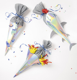 folia Schultüten-Bastelset SPACE SCHOOL, 3 Motive – Inhalt: 1x Schultütenrohling, irisierend, 6-eckig, Krepp- papier, Stanzbögen mit Veredelung, Stanzbögen irisierender Karton, Satinband, 3D Klebebpads, doppelseitiges Klebeband zum Basteln von 1 Schultüte, 3 Motive zur Auswahl (92701) Motive: Hai, Space Dinos, Rakete, inkl