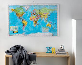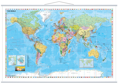 FRANKEN Carte du monde, laminé, (l)1.370 x (H)970 mm – carte avec barre métallique des 2 côtés, inscriptible et effaçable à sec, couleur cadre: blanc, matériel de fixation fourni, échelle:1:33