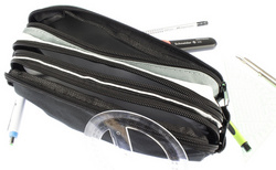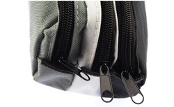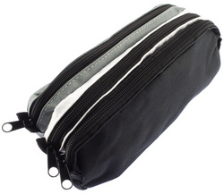 • trousse ovale avec 3 pochettes séparées à fermeture zippée