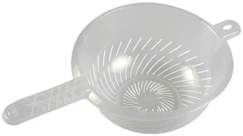 • facile à poser dans l’évier ou sur un saladier ou une casserole grâce à son manche de 120 mm et au rebord
