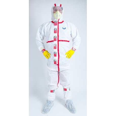 Kit à usage unique composé de : 1 combinaison de types 5 et 6, E.P.I. équipement de protection individuelle, catégorie III en nontissé 1 paire de gant, jaune, classifiée E.P.I. 1 demi-masque pliable filtrant, conforme à la norme EN149 : 2001, classe FFP3 1 paire de lunette-masque, norme EN166 1 paire de sur-botte WeePro 1 sac à déchet avec logo amiante 90 x 110 cm – 65 microns 1 rouleau adhésif, 48 mm x 33 mètres pour fermeture du sac à déchets et fixer les jonctions entre les accessoires et la combinaison 1 sac avec zip pour ensachage des éléments du kit considérés comme déchets après utilisation.