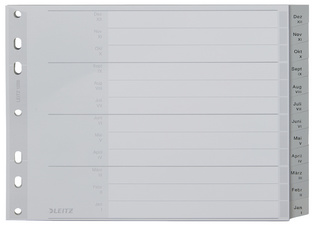 LEITZ Kunststoff-Register, Monate, A4 Überbreite, Dez.-Jan. – ————– für den Markt: D / L / A / CH ————— grau, PP, Halbe Höhe, 12-teilig, 0,12 mm, Dezember – Januar, mit beschriftbarem Deckblatt aus Karton (250 g/qm), bedruckte Taben, Premium-Ausführung, Eurolochung, Maße: (B)238 x (H)180 mm (1288-00-85)