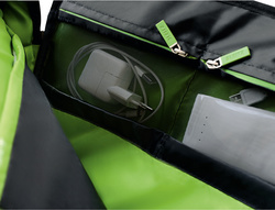 (15,6″), en Polyester, 18 compartiments, poigné en cuir, bandoulière,fixation trolley, étui enlevable, avec fermeture à glissière, noir, avec revêtement vert, dimensions interieures notebook: (L)370 x