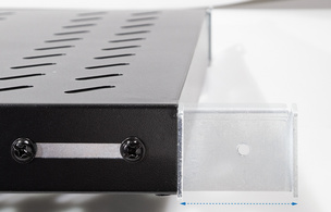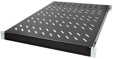 für 1.000 mm tiefe 19″ Schränke, aus Stahlblech, perforiert, Befestigung an den vorderen & hinteren 19″ Profilen, Einbautiefe verstellbar: 704 – 850 mm, Belastbarkeit: max. 50 kg, Stellfläche: 440 x 7