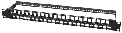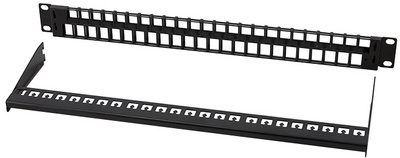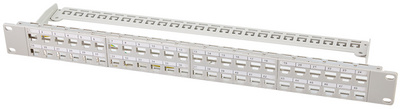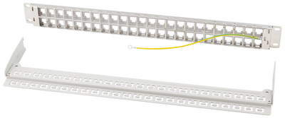 lichtgrau (RAL7035), 1 HE, unbestückt für bis zu 48 Keystone Module, geeignet für Netzwerk- & Multimedia Keystone Module bis 17 mm Breite und 21 mm Höhe, Metallrahmen mit Zugent- lastungsbügel & Schir