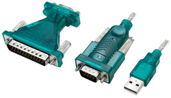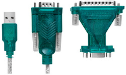 fiche mâle USB-A – fiche mâle Sub-D à 9 broches, adaptateur femelle Sub-D 9 broches – mâle Sub-D 25 broches, fixation par vis moletées, alimentation électrique via port USB, vert transparent, débit de