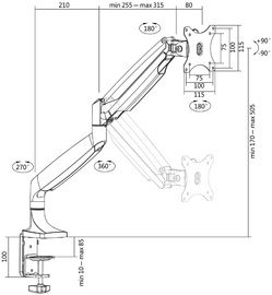 Bras support pour écran, en aluminium, longueur du bras: 525 mm pour écran de 33,02 à 81,28 cm (13″