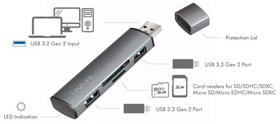 corps aluminium, entrée: USB-A mâle, sortie: 2x USB-A femel- le, 1x micro SD & 1x SD, avec capuchon de protection, lumiè- re LED bleue, protecion contre la surintensité & la surten- sion, dimensions: