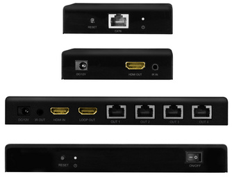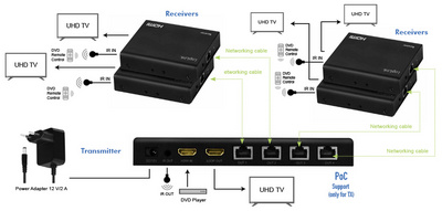 • contenu de la livraison : 1 x émetteur HDMI, 2 x récepteur HDMI, 1 x câble IR TX, 4 x câbles IR RX, 1 x alimentation 12V/ 2A, 10 x support de montage et manuel d’utilisation Exemples d’utilisation :