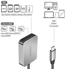 pour cartes SD & microSD, supporte les cartes: SD/SDHC/SDXC/ microSD/SDHC/SDXC/MMC & RS, espace mémoire: jusqu’à 1 TB, taux de transfert: jusqu’à 5 Gbit/s, longueur câble: 150 mm, couleur: gris, dimen