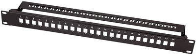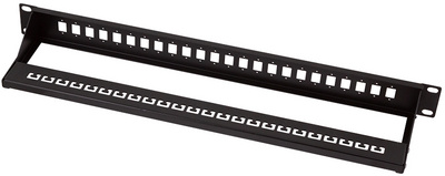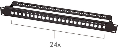 1U, pour 24 LC Duplex ou SC Simplex femelles, pour montage dans armoire 19″, 24 découpes d’env. 13,3 x 9,6 mm, en tôle d’acier, porte-câble amovible, livré sans adaptateur, dimensions: (L)483 x (P)100