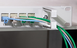 gris clair (RAL9005), 1 U, blindé, pour 16 modules Keystone, non garni, avec support de câbles et rail & câble de mise à la terre, cadre acier 19″, avec 3 boucles passe-câbles en plastique, kit de fix