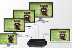 quadruple, noir, entrée : 1x femelle HDMI, sortie : 4 x femelle HDMI, supporte HDMI 2.0b, compatible avec les spéci- fications HPCP 2.2, affichage LED de k’état de charge & dis- positifs de sortie, Pl