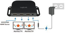 double, noir, entrée : 1x femelle HDMI, sortie : 2 x femelle HDMI, supporte HDMI 2.0b, compatible avec les spécifications HPCP 2.2, affichage LED indiquant l’état de charge & dispo- sitifs de sortie,