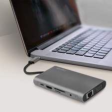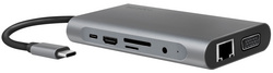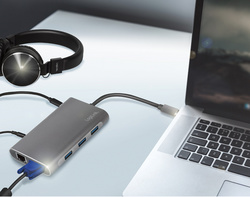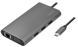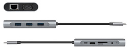 entrée: mâle USB-C, 1x femelle USB-C PD, sortie: 3x femelle USB-A 3.0, 1x femelle HDMI-A, 1x prise jack femelle 3,5 mm, 1x femelle VGA, 1x femelle RJ45 Gigabit Ethernet, 1x lecteur de cartes SD / micr