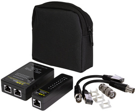 testeur de câble, 1 unité réceptrice et émettrice, 2 adaptateurs de câble BNC, 1 adaptateur BNC femelle – femelle, 2 adapteurs RJ45 – RJ11 et manuel d’installation Exemples d’utilisation: