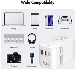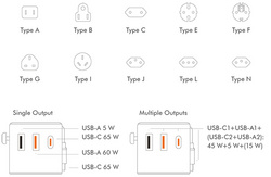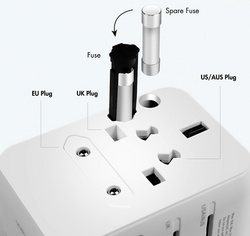 aus feuerfestem Material, eingebaute 10A-Sicherung, Ausgang: 1x USB-C Kupplung, 1x USB-C Stecker (mit 800 mm Kabel), 1x USB-A Kupplung, 1x AC Steckdose, mit Geräteschutz, LED- Anzeige, inkl. 4 austaus