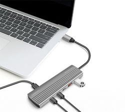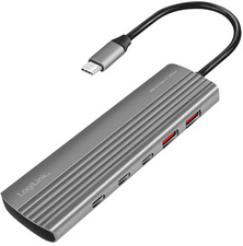 Aluminiumgehäuse, grau, Ausgang: 2x USB-A / 8x USB-C Kupplung, Eingang: 1x USB-C Kupplung / 1x USB-C Stecker mit Kabel, kompatibel zu USB 3.2 Gen 2 (Thunderbolt 3/4 kompa- tibel), Übertragungsrate: 10