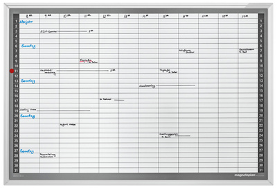 magnetoplan Planning mensuel, (L)920 x (H)625 mm – tableau de planning magnétique avec cadre en aluminium, avec données imprimées, 12 colonnes, espace horaire: 70 x 17 mm, avec 1 marqueur avec essuie-tableau intégré, 1 marqueur effacable à l’eau,1 aimant journalier et 12 aimants mensuels (1249512S)