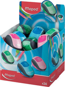 Maped Double taille-crayon Clean, assorti, présentoir de 24 – pour 2 types de crayon, en plastique, avec réservoir translucide et couvercle de protection – fermeture automatique après usage, couleurs assorties: rose/blanc, bleu/blanc et vert/blanc, en paquet de 24 pièces (030211) intérieur taille-crayon en plastique, dimensions présentoir: (L)145 x(P)128x(H)135,5 mm