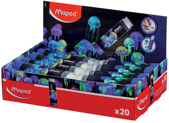 Maped Gomme en plastique DEEPSEA PARADISE, présentoir de 20 – format rouge à lèvres, gomme extractible par dévissage, boîtier en plastique avec motif méduses & capuchon, gomme blanche, sans PVC, rechargeable en paquet de 20 pièces dans un présentoir (152012)