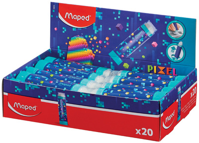 Maped Gomme en plastique PIXEL PARTY, présentoir de 20 – format rouge à lèvres, gomme extractible par dévissage, boîtier en plastique avec motif pixels & capuchon, gomme blanche, sans PVC, rechargeable en paquet de 20 pièces dans un présentoir (152014)