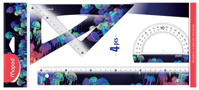 Maped Kit de géometrie DEEPSEA PARADISE, 4 pièces – en plastique, avec motif méduses, contenu: règle 300 mm, équerre 60 degrés 210 mm, équerre 45 degrés 210 mm, rapporteur 180 degrés 120 mm (981833)
